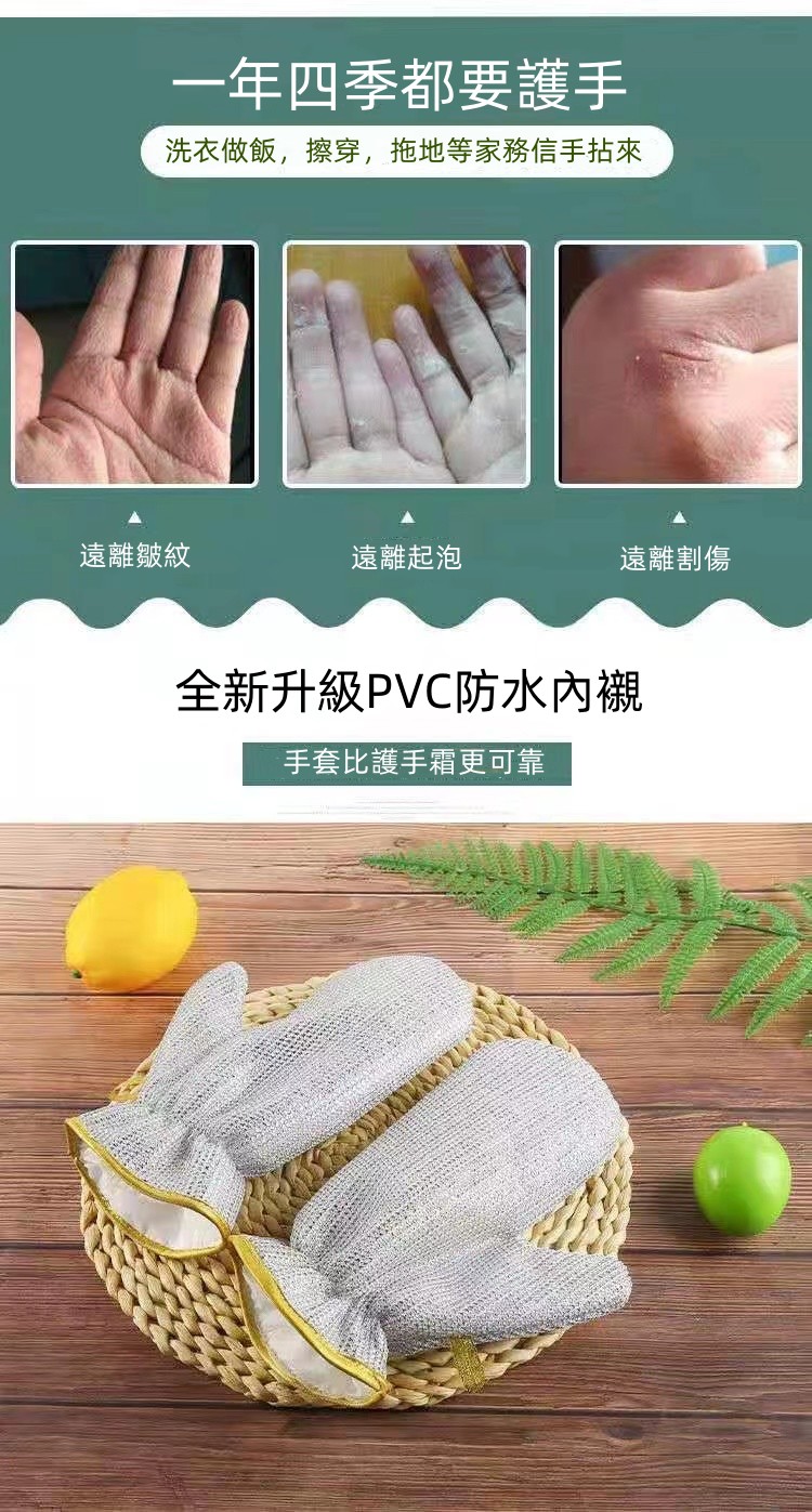 半小時前鋼絲洗碗手套,一年四季都要護手,全新升級pvc防水內襯,耐熱性強,阻擋酸堿,抹布與清潔球的結合體,自帶掛繩方便收納 - 嘗鮮【買三送二】5雙-NT$990